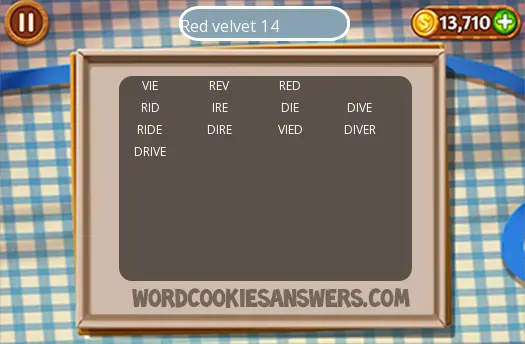 Here there are Word Cookies Red Velvet Level 14 Answers from Talented Chef Pack RED REV RID RIDE DRIVE DIRE DIVE DIVER DIE VIE IRE VIED If you find wrong word answers in any of these posts then I encourage you to write a comment on the form. If you need help with any specific puzzle pack leave your comment below.