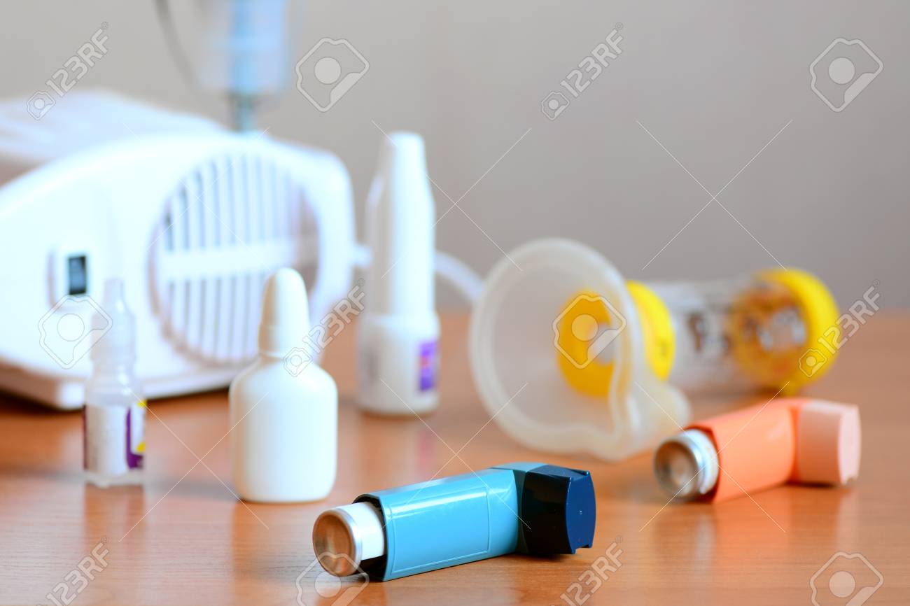 Equipo Medico Y Medicamentos Para El Tratamiento Del Asma Nebulizador Inhalador Espaciador Nebulosa Medicamentos Antiinflamatorios Para Controlar El Asma Asma Bronquial Concepto De Alergia Fotos Retratos Imagenes Y Fotografia De Archivo Libres